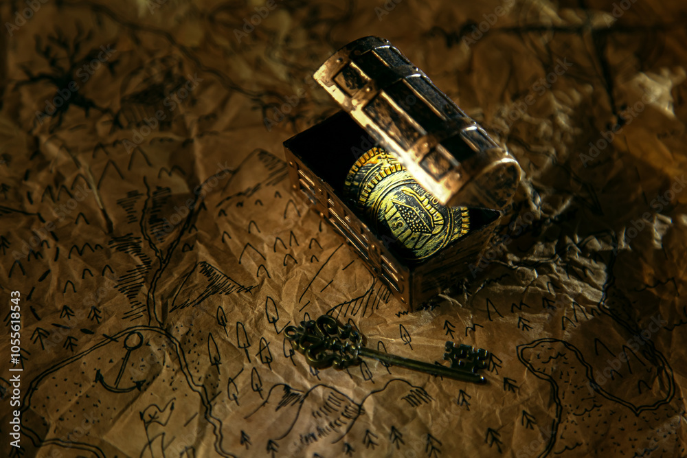 Homemade aged pirate map of treasure island on parchment.