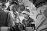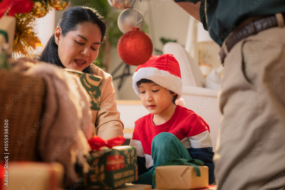 A joyful holiday scene featuring woman and young boy in festive attire, surrounded by Christmas gifts and decorations. warmth of moment captures spirit of giving and family togetherness