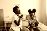 Mother and daughter applying lipstick together in a cozy bedroom