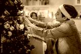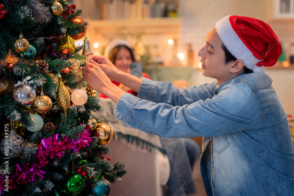 A joyful man in Santa hat decorates Christmas tree with colorful ornaments, creating festive atmosphere. woman in background enjoys holiday spirit