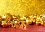 golden Snake figurine with 2025 numbers and festive new year decoration on abstract glittering background close up. symbol of Chinese new year 2025, Year of the snake. lunar calendar concept