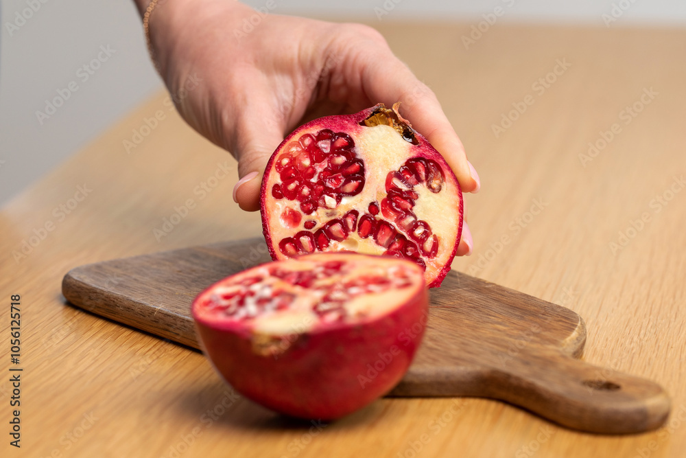 A woman bursts a grenade in close-up on a wooden table. Fruits.