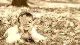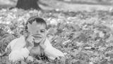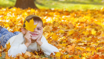 Happy boy in autumn park. Autumn.