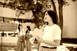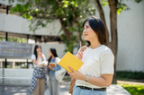 A pretty Asian female college student stands in a college park, looking away as if daydreaming.
