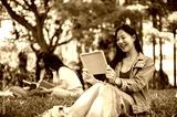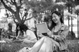 A beautiful Asian female college student sits on grass in a park, using her digital tablet.