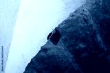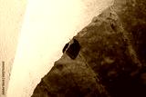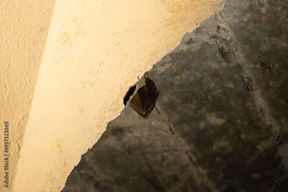 ritratto in primo piano, dal basso, di un piccolo pipistrello, in letargo, appeso a testa ingiù ad un soffitto dentro una vecchia cavità artificiale abbandonata