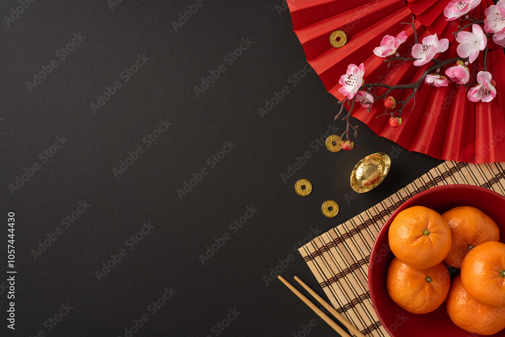 Festive flat lay featuring Chinese New Year elements. Includes mandarin oranges, gold ingot, coins, cherry blossoms, and a red fan, symbolizing prosperity
