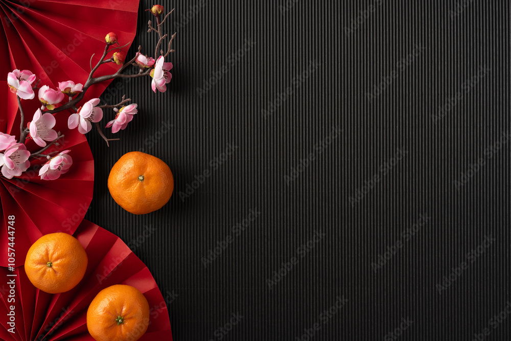 Vibrant image of Chinese new year with red fans, oranges, and blossoms symbolizing prosperity and good fortune