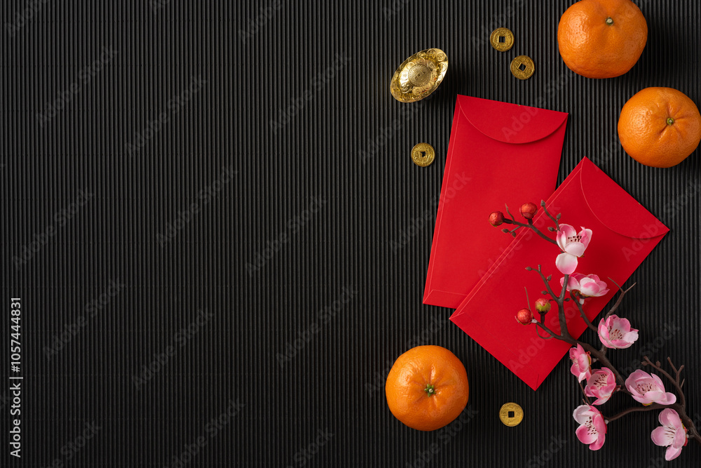 Chinese New Year celebration items including red envelopes, oranges, and flowers on a textured background, symbolizing prosperity and good fortune