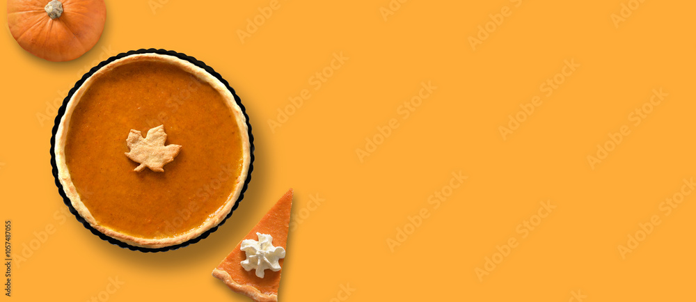 Homemade Traditional American Pumpkin Pie with spices, cinnamon, cardamom, ginger for Thanksgiving Day on orange background. View from above. Copy space.