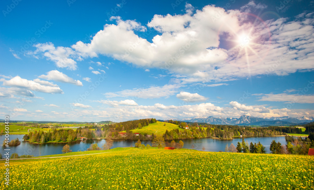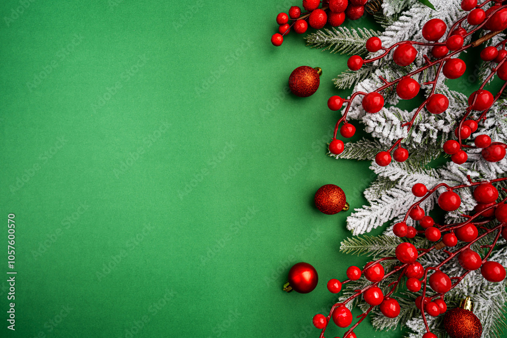 Christmas and Happy New background with red glitter decorations on green bright background. Holiday party decoration . Christmas celebration, holiday card
