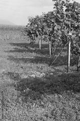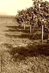 Italian Pinot gris vineyard near yellow soybean and corn field on autumn season