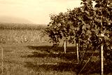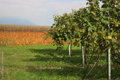 Italian Pinot gris vineyard near yellow soybean and corn field on autumn season