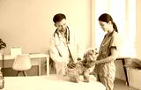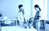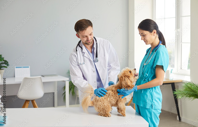 Veterinarian doctor and nurse work together to examine a dog during a checkup in a hospital office. The medical team provides healthcare aid and vet support to ensure the pet health and well being.
