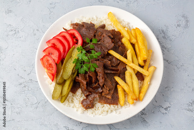 Meat doner menu, iskender menu on plate, turkish special meat doner, food, special menu (Turkish name; pilav üstü et doner)