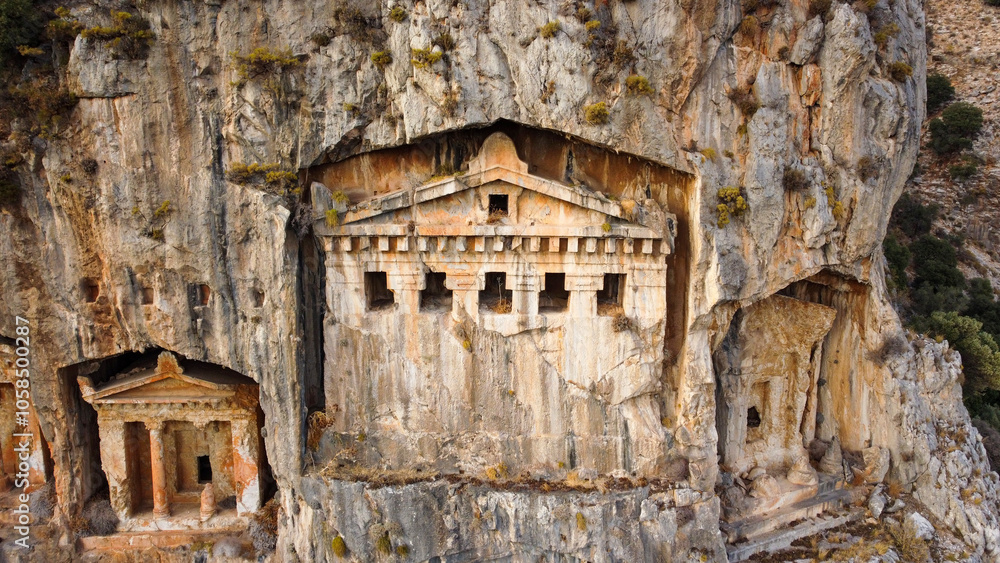Rock-cut temple tombs in Kaunos Dalyan - Turkey (Turkish name; kaya mezarlari) Ancient city of Kaunos, Dalyan valley, Turkey. Kaunos (Latin: Caunus) was a city of ancient Caria and in Anatolia
