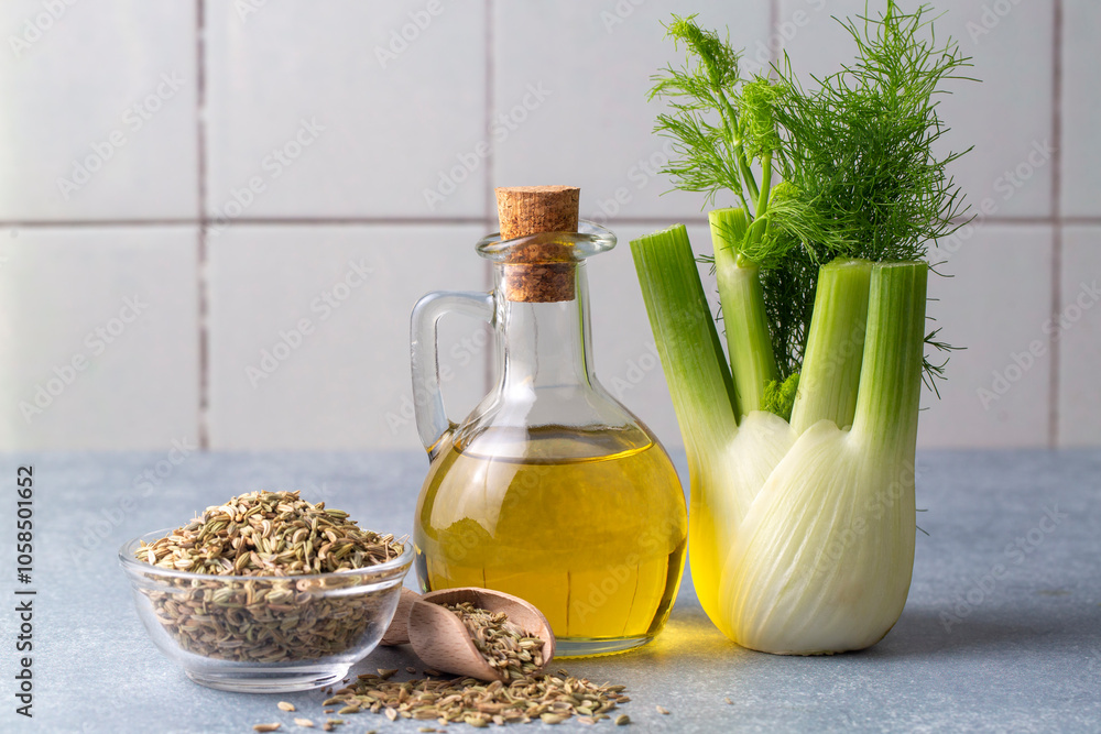 A bottle of fennel essential oil with fresh green fennel twigs and fennel seeds - Fennel oil