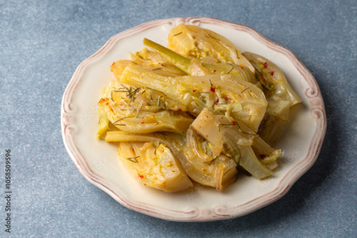 Organic Baked Fennel Bulbs with Salt and Pepper. Fennel dish with olive oil.