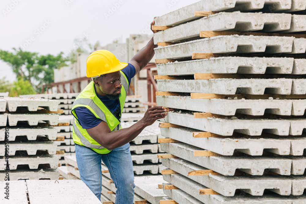 African Black worker male working in concrete precast plant factory check quality production at site.