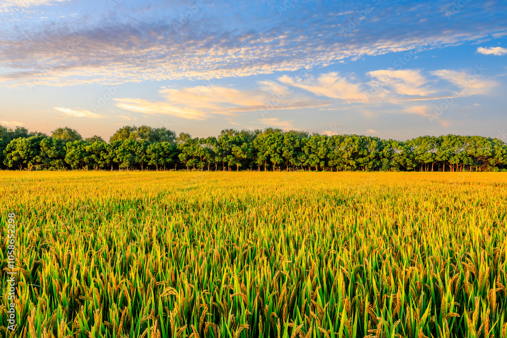 Ripe rice fields and green forest natural landscape at sunset. autumn season.