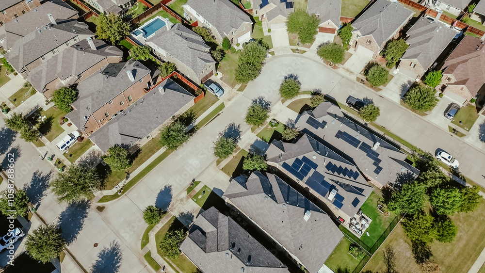Panorama aerial view solar panel roofing on modern corner houses new construction residential neighborhood in Argyle, Denton County, Texas, upscale two-story suburban home, well maintained lawn