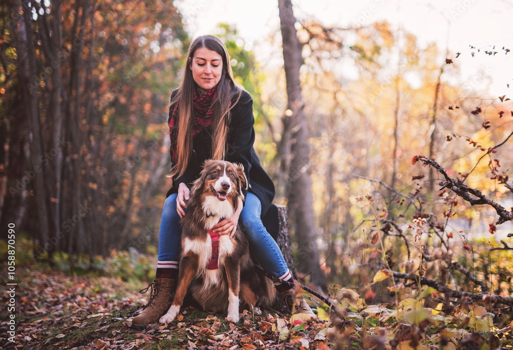 Loving young woman with her shepherd Australian on fall season