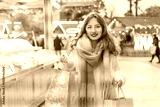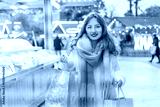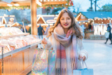 Happy woman enjoys shopping at festive Christmas market while carrying shopping paper bags, walking in street Xmas fair of European city. Selecting gifts for New Year, winter holiday sales, discounts.