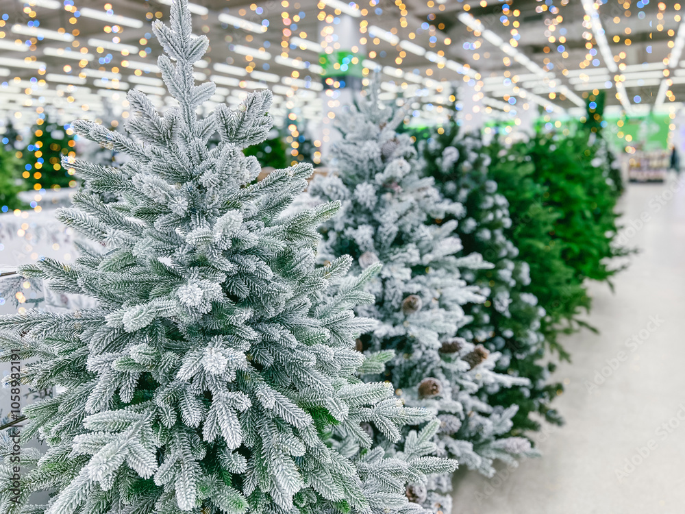 Decorative artificial christmas trees in the store. Christmas decorations for sale. Festive decorations for Christmas holidays.