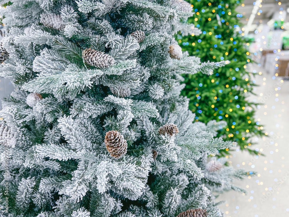 Decorative artificial christmas trees in the store. Christmas decorations for sale. Festive decorations for Christmas holidays.