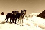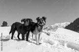 Two dogs stand in snow, looking at the camera. One is brown with a white chest mark, the other is gray, black, and white with a thick coat. Snowy mountains and a clear blue sky create a calm, wintery