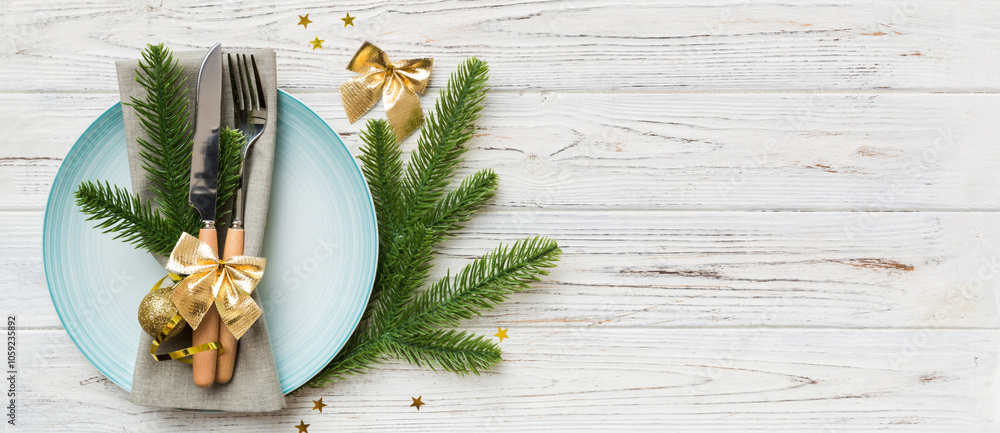 Christmas table place setting with christmas decor and plates, kine, fork and spoon. Christmas holiday background. Top view with copy space