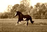 A beautiful horse walks in the meadow and eats grass