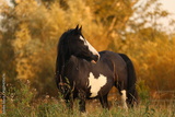 A beautiful horse walks in the meadow and eats grass