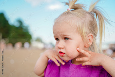 Caucasian little child girl two-year-old on a public beach in summer.