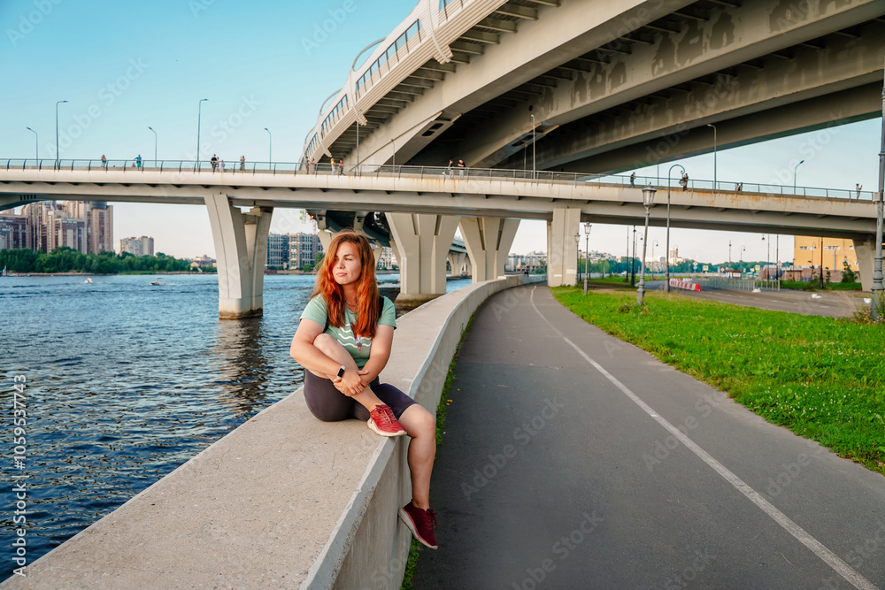 Young woman near the Yacht pedestrian bridge under the automobile bridges, child in the big city, St. Petersburg