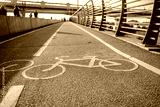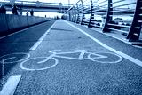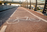 The sign of the bike path on the red asphalt.