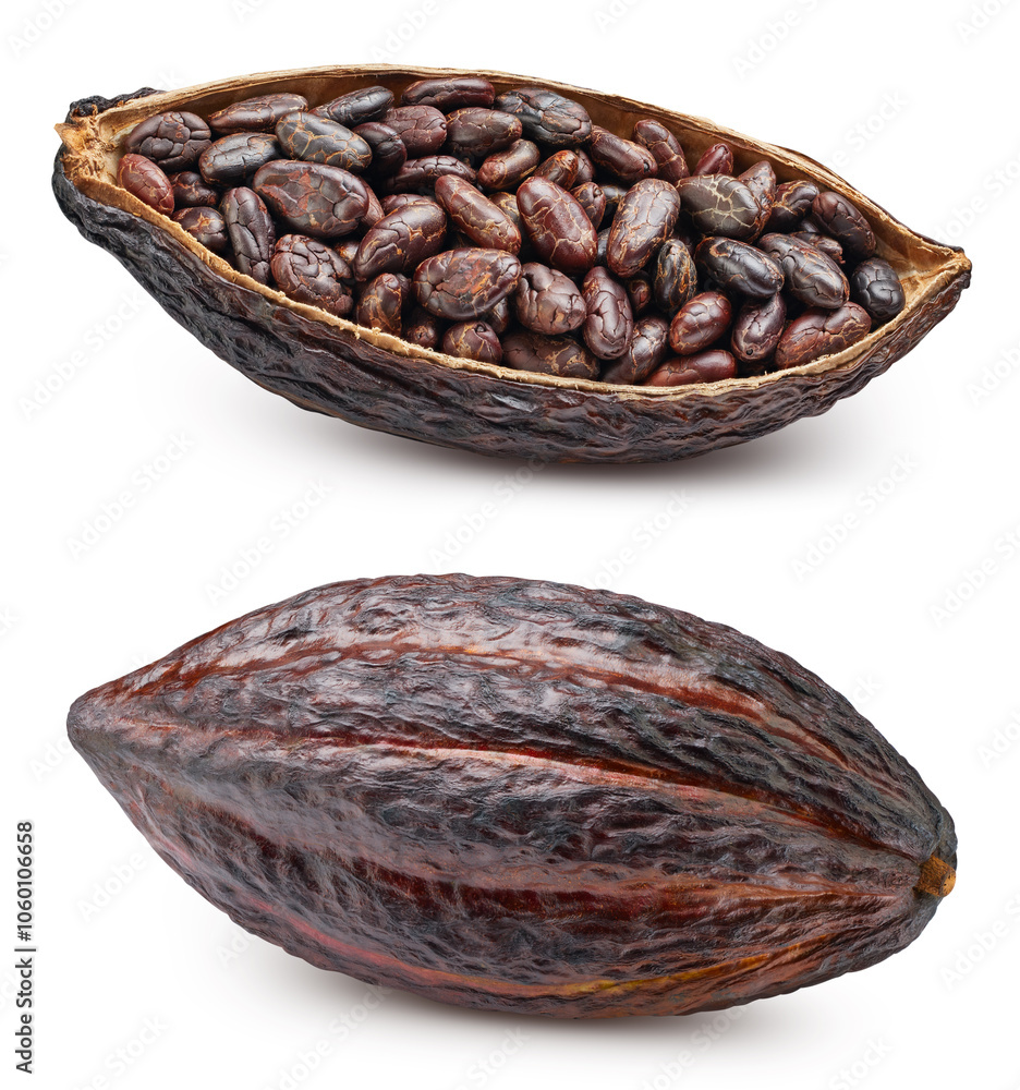 Fresh organic Cocoa isolated clipping path. Cocoa pod, beans and isolated on a white. Cocoa half