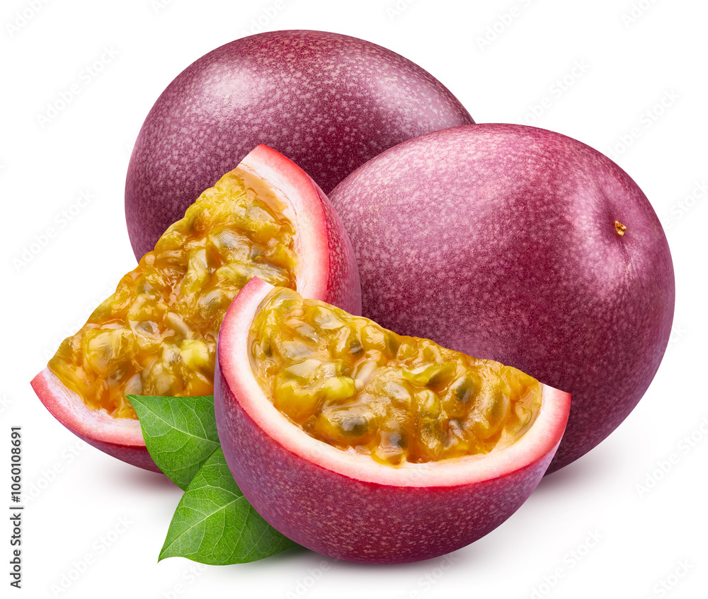 Passion fruit and leaves isolated on a white background. Passion with leaves clipping path