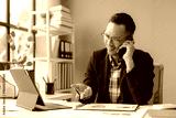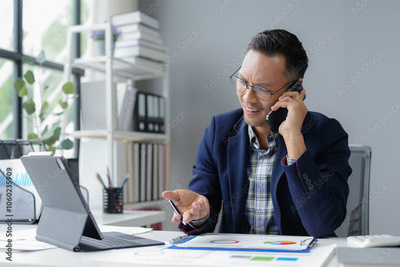 Stressed asian businessman having phone call discussing bad news about financial charts using digital tablet
