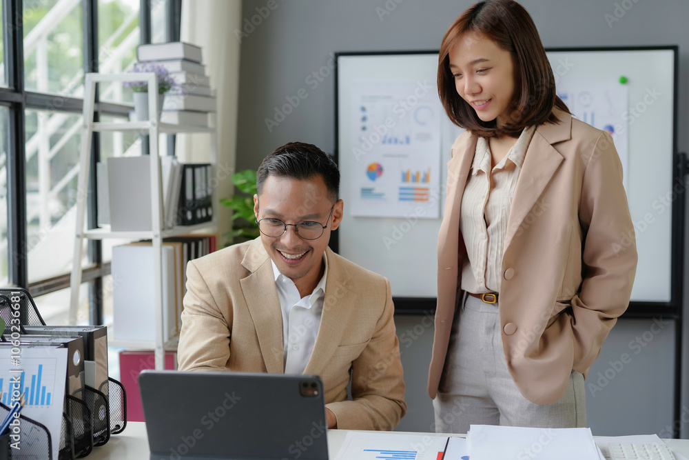 Two businesspeople smiling and working together in modern office using tablet, analyzing charts and business data on screen