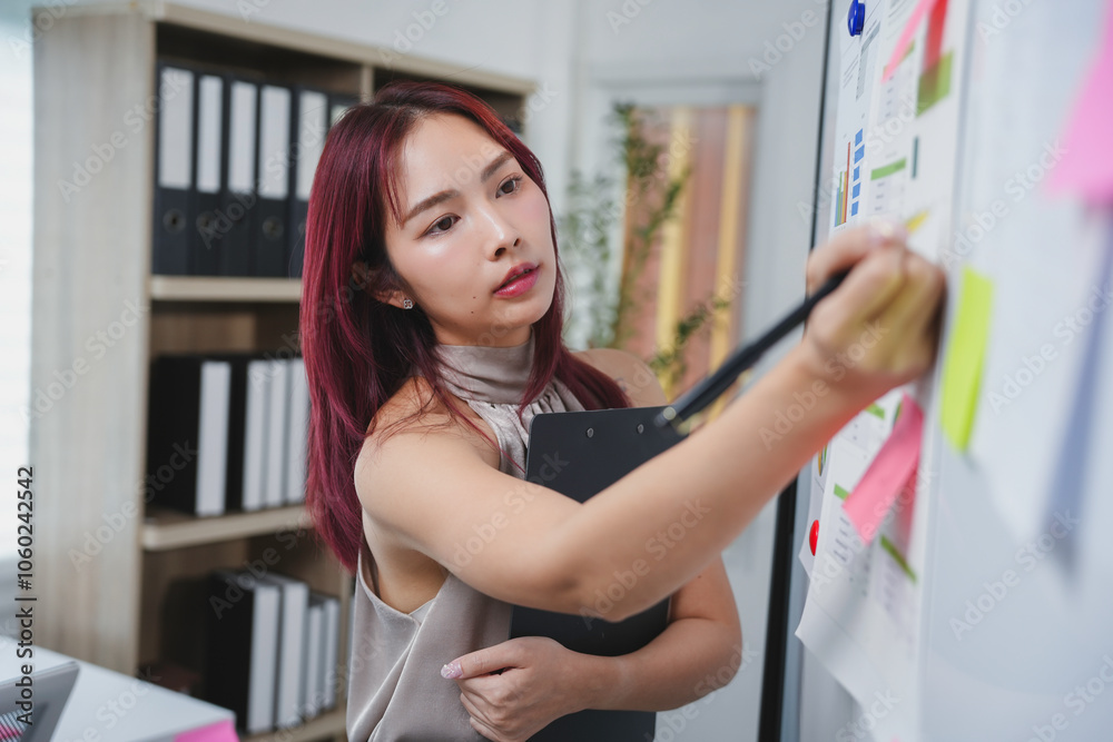 Businesswoman is holding a clipboard and writing on a whiteboard with colorful sticky notes during a productive workday at the office