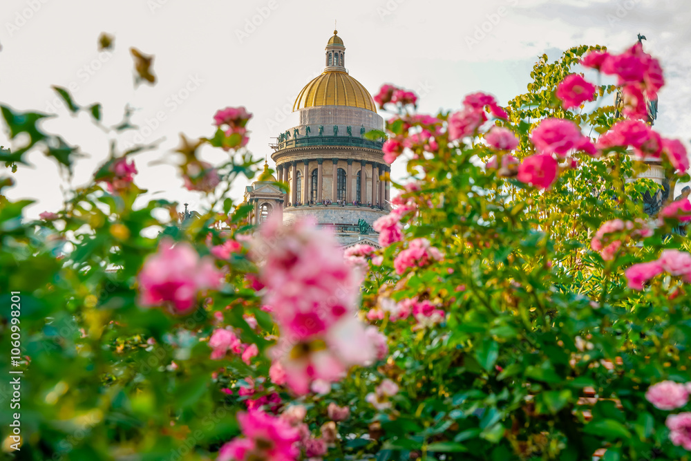 Beautiful urban landscape in summer St. Isaac's Cathedral in St. Petersburg, a field of flowers.