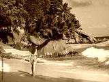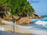 Cute woman walking on stunning white sand beach with palm trees and rocks in the background. Beautiful views and sights of Seychelles. Clear, warm sunlight. Outdoor. Concept of leisure and travel