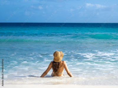 Cute woman sitting on stunning white sand beach with palm trees and rocks in the background. Beautiful views and sights of Seychelles. Clear, warm sunlight. Outdoor. Concept of leisure and travel