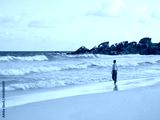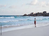 Cute woman walking on stunning white sand beach with palm trees and rocks in the background. Beautiful views and sights of Seychelles. Clear, warm sunlight. Outdoor. Concept of leisure and travel