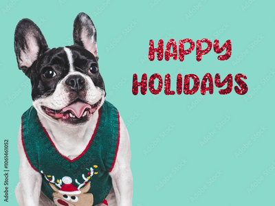Happy Holidays. Lovable puppy and congratulatory inscription. Closeup, indoors. Day light, studio shot. Congratulations for family, relatives, loved ones, friends and colleagues. Pet care concept