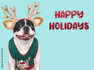 Happy Holidays. Lovable puppy and congratulatory inscription. Closeup, indoors. Day light, studio shot. Congratulations for family, relatives, loved ones, friends and colleagues. Pet care concept