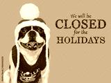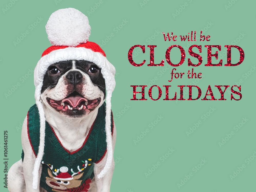 Signboard with the inscription We will be closed for the Holidays. Cute puppy and text for the sign. Closeup, indoors. Studio shot. Pets care concept