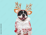 Merry Christmas and Happy New Year. Cute puppy, festive costume and space for greeting inscription. Closeup, indoors. Studio shot. Congratulations for family, friends and colleagues. Pet care concept