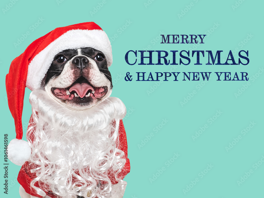 Happy Holidays. Lovable puppy and congratulatory inscription. Closeup, indoors. Day light, studio shot. Congratulations for family, relatives, loved ones, friends and colleagues. Pet care concept
